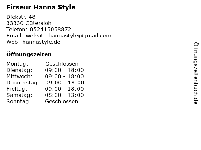 | Öffnungszeiten Firseur Hanna Style in Gütersloh anzeigen | |