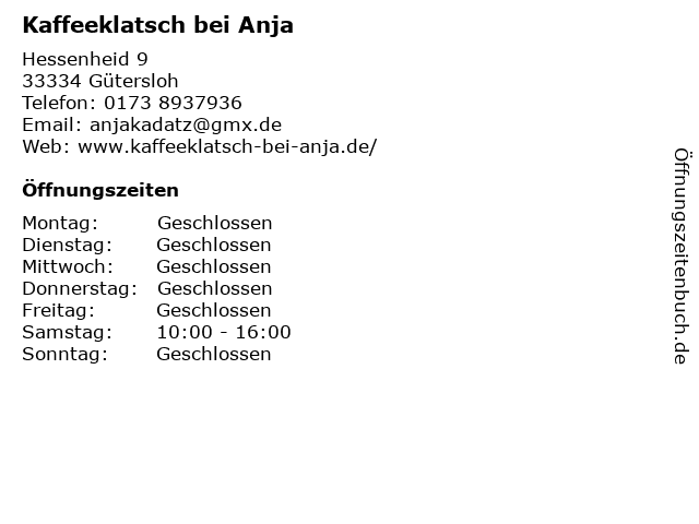 | Öffnungszeiten Kaffeeklatsch bei Anja in Gütersloh anzeigen | |