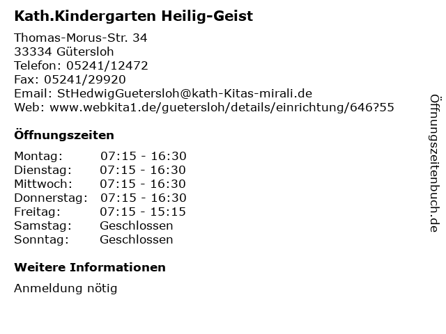 1 Pfarrbüro Kath. Kirchengemeinde Heilig Geist (Entfernung: 0,08 km) Thomas-Morus-Str. 26, 33334 Gütersloh 6 |