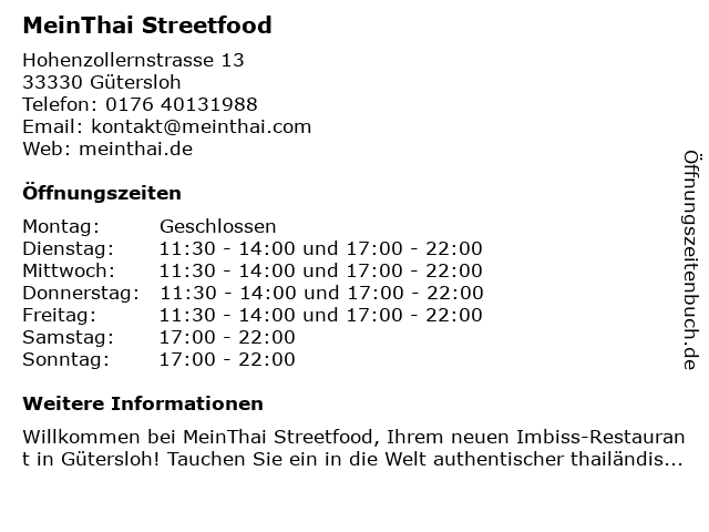 | Öffnungszeiten MeinThai Streetfood in Gütersloh anzeigen | |