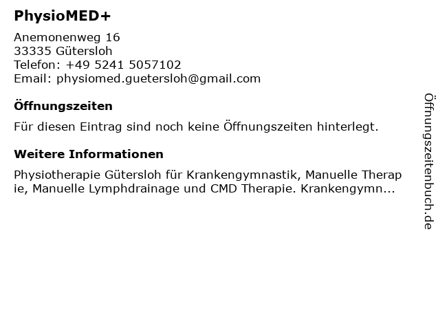 | Öffnungszeiten PhysioMED+ in Gütersloh anzeigen | |