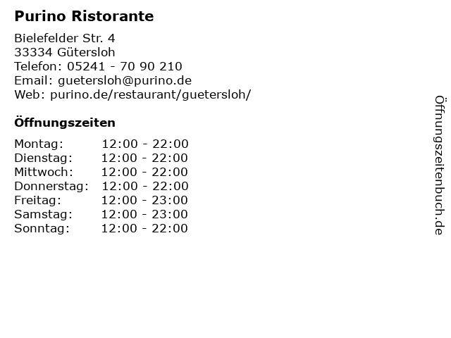 | Öffnungszeiten Purino Ristorante in Gütersloh anzeigen | |