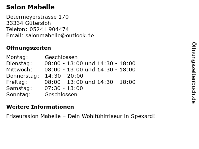 | Öffnungszeiten Salon Mabelle in Gütersloh anzeigen | |