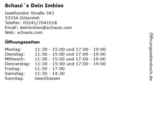 | Öffnungszeiten Schaui´s Dein Imbiss in Gütersloh anzeigen | |