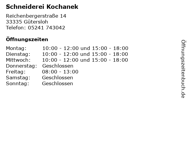 | Öffnungszeiten Schneiderei Kochanek in Gütersloh anzeigen | |