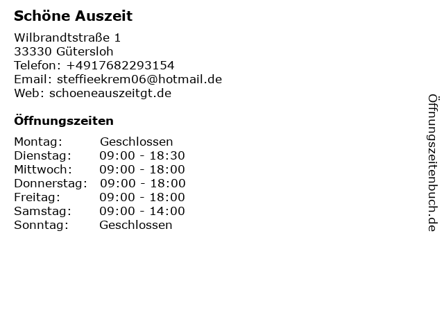 | Öffnungszeiten Schöne Auszeit in Gütersloh anzeigen | |