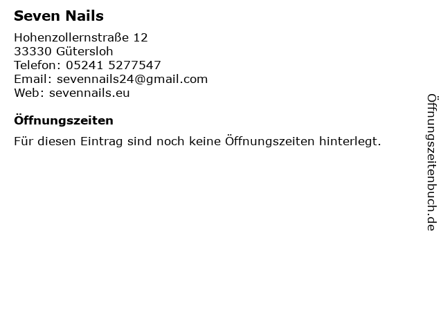 | Öffnungszeiten Seven Nails in Gütersloh anzeigen | |