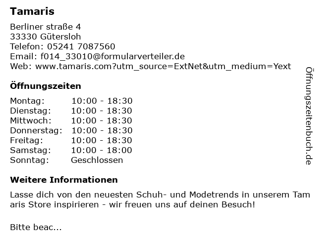 | Öffnungszeiten Tamaris in Gütersloh anzeigen | |
