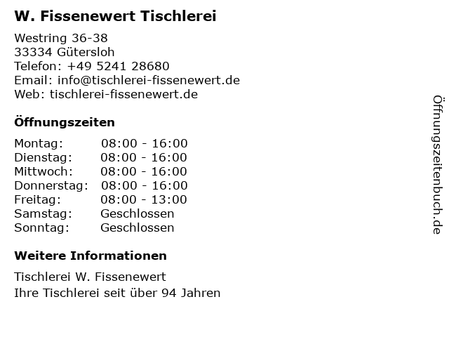 Öffnungszeiten W. Fissenewert Tischlerei in Gütersloh anzeigen | |
