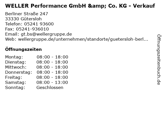2 WELLER Performance GmbH & Co. KG - Teile & Zubehör (Entfernung: 0,03 km) Berliner Str. 247, 33330 Gütersloh 6 Dr. Hans-Ulrich Weller & Kollegen - Praxis für Allgemein - und innere Medizin (Entfernung: 12,48 km) Deckertstaße 53, 33617 Bielefeld |