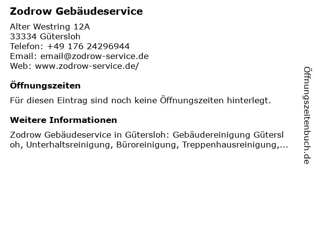 | Öffnungszeiten Zodrow Gebäudeservice in Gütersloh anzeigen | |