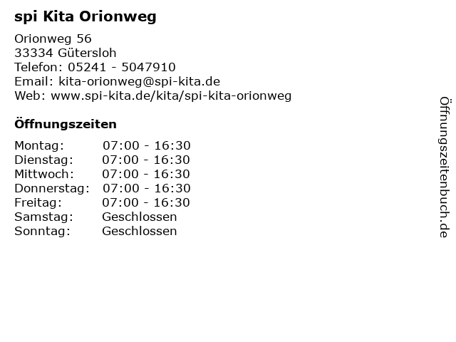 | Öffnungszeiten spi Kita Orionweg in Gütersloh anzeigen | |