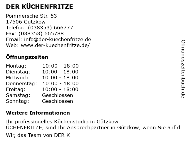 | Öffnungszeiten DER KÜCHENFRITZE in Gützkow anzeigen | |