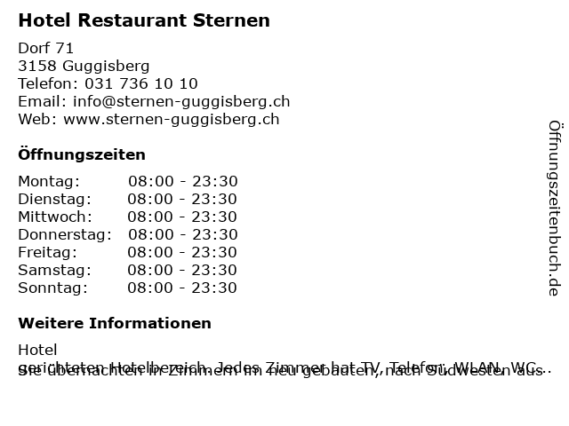 | Öffnungszeiten Hotel Restaurant Sternen in Guggisberg anzeigen | |