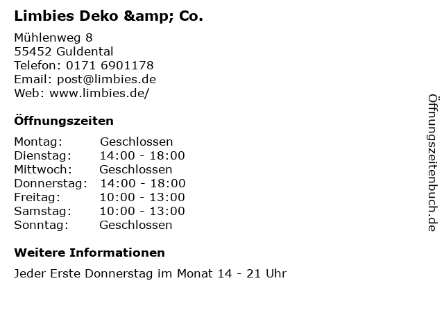 | Öffnungszeiten Limbies Deko & Co. in Guldental anzeigen | |