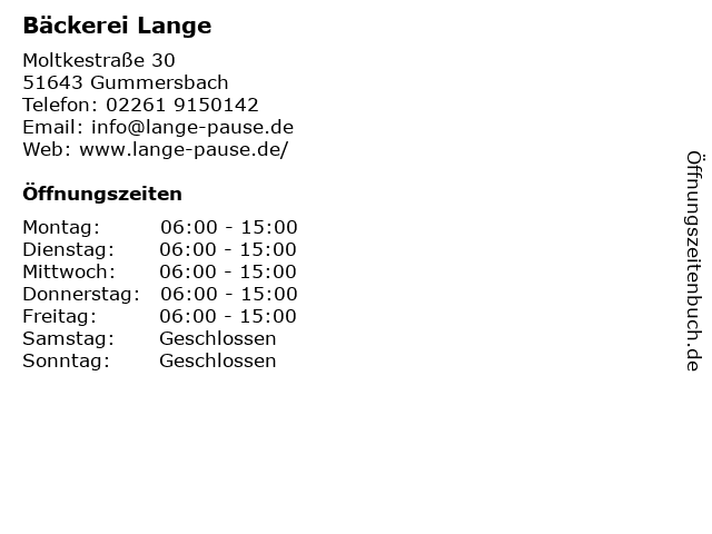 | Öffnungszeiten Bäckerei Lange in Gummersbach anzeigen | |