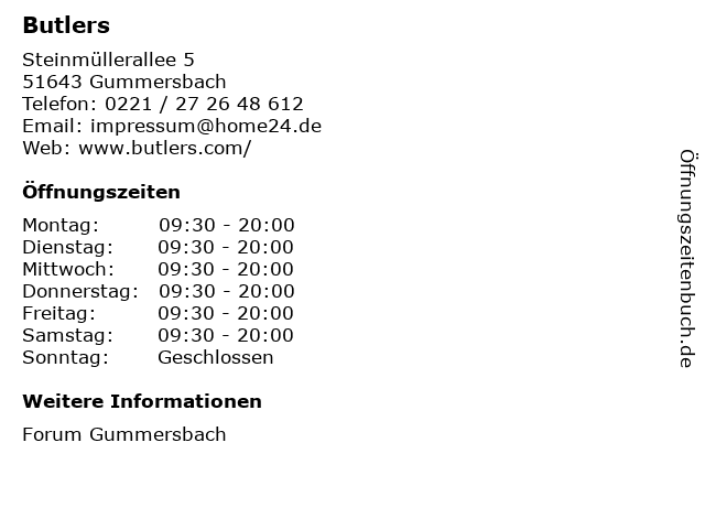 | Öffnungszeiten Butlers in Gummersbach anzeigen | |