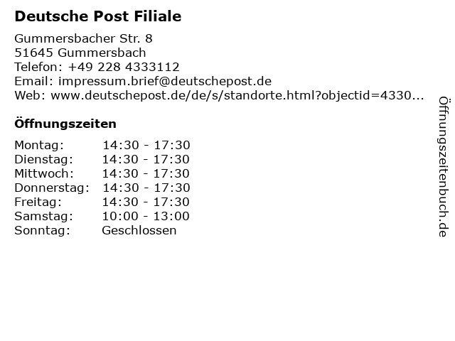 Öffnungszeiten Deutsche Post Filiale in Gummersbach anzeigen