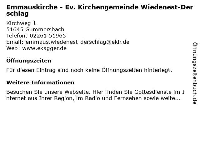 | Emmauskirche - Ev. Kirchengemeinde Wiedenest-Derschlag anrufen | |