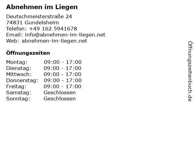 | Öffnungszeiten Abnehmen im Liegen in Gundelsheim anzeigen | |