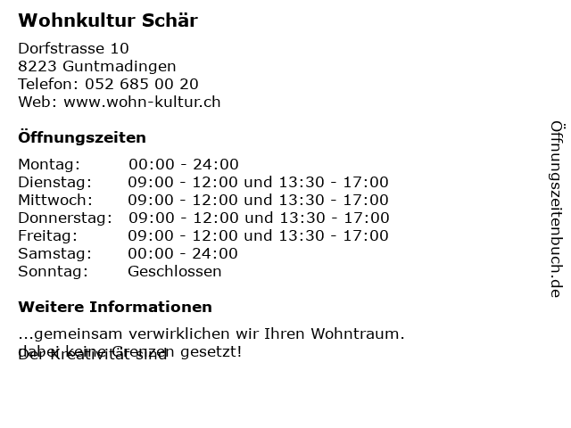 | Öffnungszeiten Wohnkultur Schär in Guntmadingen anzeigen | |