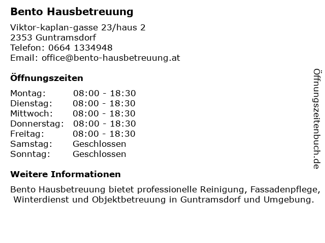 | Öffnungszeiten Bento Hausbetreuung in Guntramsdorf anzeigen | |