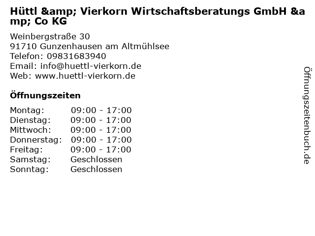 1 Hüttl & Vierkorn Wirtschaftsberatungs GmbH & Co.KG (Entfernung: 0,00 km) Weinbergstraße 30, 91710 Gunzenhausen 3 Hüttl & Kollegen Steuerberater & Rechtsanwälte GmbH (Entfernung: 1,59 km) Waagstr. 3, 91710 Gunzenhausen 4 Steuerberatungsgesellschaft mbH Hüttl & Kollegen (Entfernung: 16,95 km) Innere Türkengasse 2, 91781 Weißenburg 6 KNAPPE PROZESSE – Organisations- & Systemgestaltung (Entfernung: 36,85 km) Krumbacher Str. 10, 90455 Nürnberg |