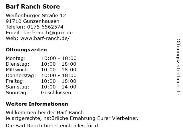 | Öffnungszeiten Barf Ranch Store in Gunzenhausen anzeigen | |