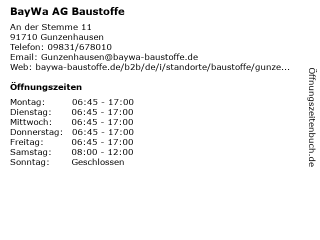 | Öffnungszeiten BayWa AG Baustoffe in Gunzenhausen anzeigen | |