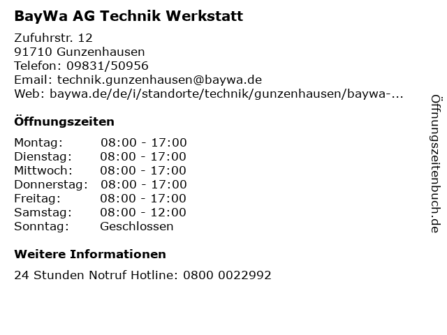 4 BayWa Bau- & Gartenmärkte GmbH & Co. KG Gunzenhausen (Entfernung: 1,79 km) Weißenburger Straße 110, 91710 Gunzenhausen 6 |