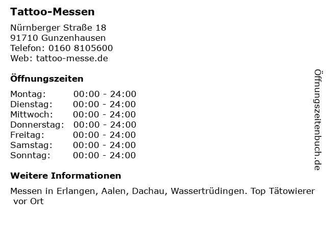 | Öffnungszeiten Tattoo-Messen in Gunzenhausen anzeigen | |