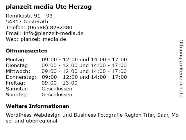 | Öffnungszeiten planzeit media Ute Herzog in Gusterath anzeigen | |