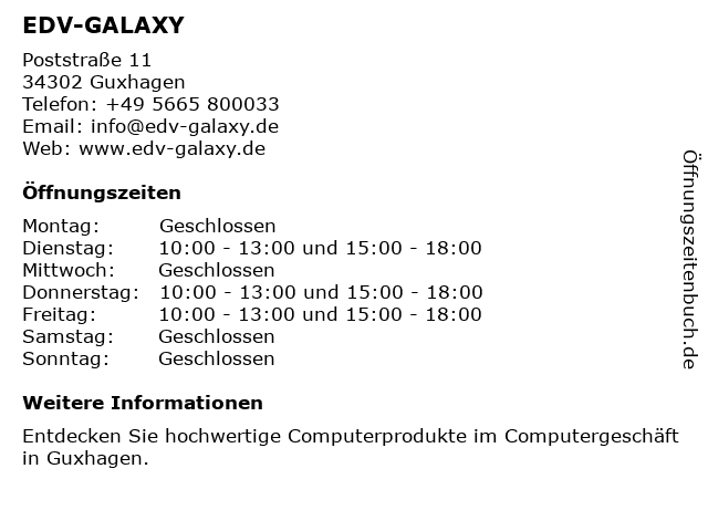 | Öffnungszeiten EDV-GALAXY in Guxhagen anzeigen | |
