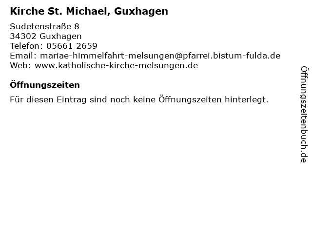 | Öffnungszeiten Kirche St. Michael, Guxhagen in Guxhagen anzeigen | |