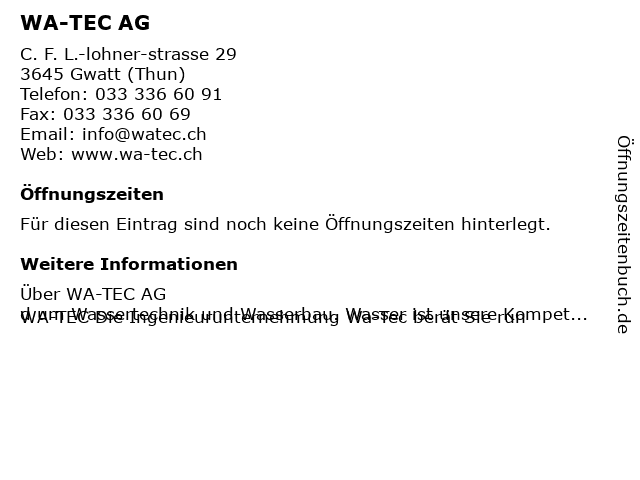 | Öffnungszeiten WA-TEC AG in Gwatt (Thun) anzeigen | |