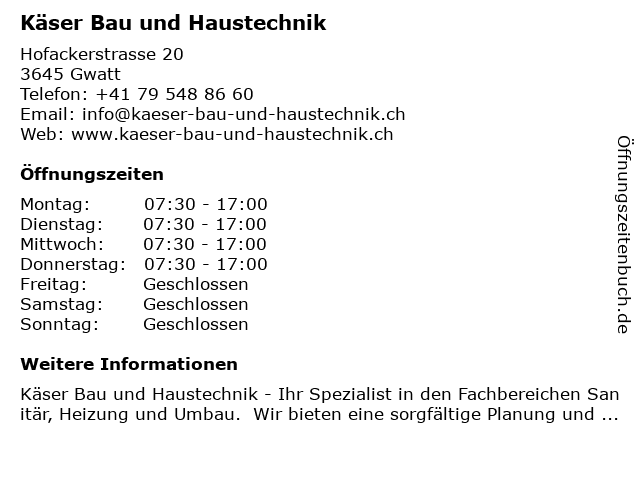 | Öffnungszeiten Käser Bau und Haustechnik in Gwatt anzeigen | |