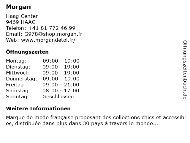 | Öffnungszeiten Morgan in HAAG anzeigen | |