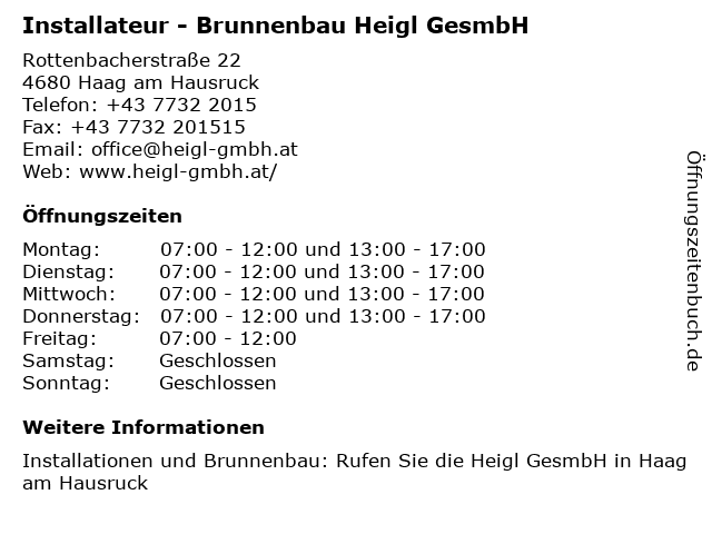 1 Heigl GesmbH Gas - Wasser - Heizung - Brunnenbau (Entfernung: 0,01 km) Rottenbacher Straße 22, 4680 Haag am Hausruck 3 LBH - Lüftungs- Behälter- und Heizungsanlagenbau GesmbH (Entfernung: 8,00 km) Imling 12 II, 4902 Wolfsegg 6 |