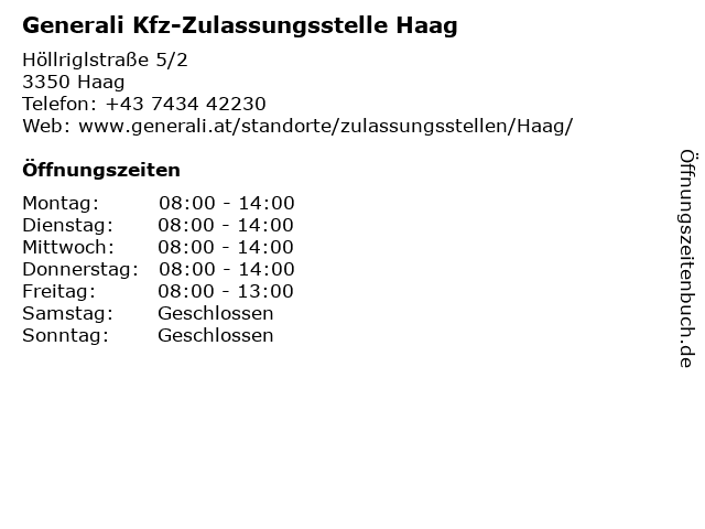 1 Generali Versicherung AG - Geschäftsstelle Haag - Kfz-Zulassungsstelle (Entfernung: 0,09 km) Hauptplatz 11, 3350 Haag 6 |