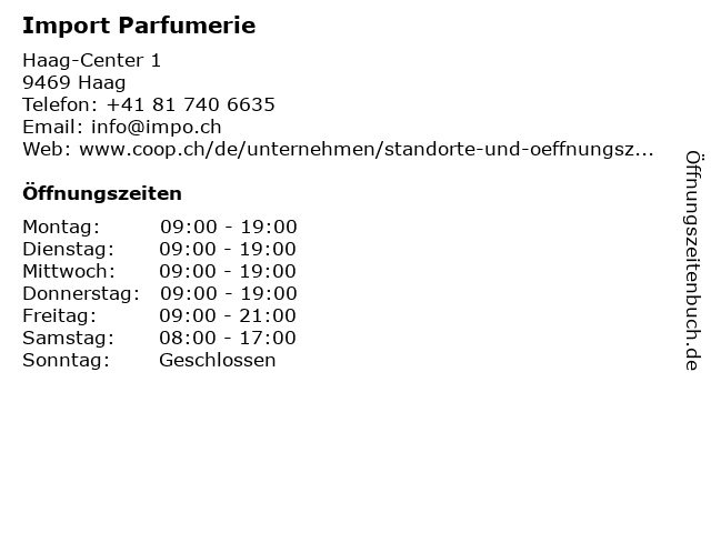 | Öffnungszeiten Import Parfumerie in Haag anzeigen | |