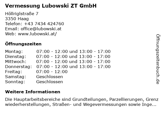 | Öffnungszeiten Vermessung Lubowski ZT GmbH in Haag anzeigen | |