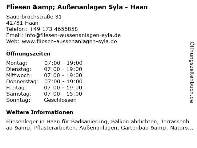 Branchen & Suchbegriffe zu Fliesen & Außenanlagen Syla - Haan:außenanlagen, außenanlagenbau, badezimmer fliesen, badsanierung, balkon abdichten, bodenfliesen, fliesen, fliesenarbeiten, fliesenleger, gartenbau, gartengestaltung, gartenpflege, hof pflastern, landschaftsbau, mosaik, naturstein, pflasterarbeiten, pflastersteine verlegen, renovierung, sanierung, syla, terrassenbau, terrassenplatten |