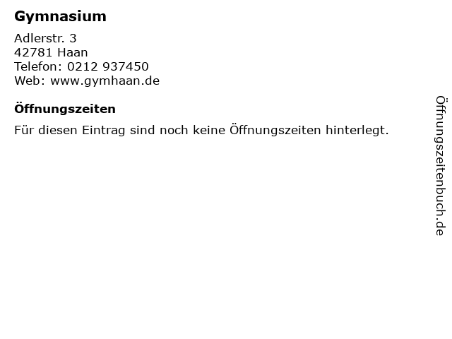 | Öffnungszeiten Gymnasium in Haan anzeigen | |