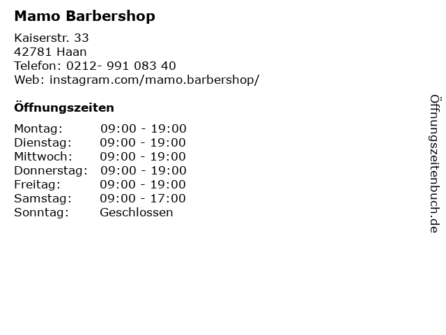 | Öffnungszeiten Mamo Barbershop in Haan anzeigen | |