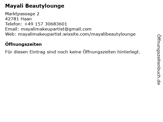| Öffnungszeiten Mayali Beautylounge in Haan anzeigen | |