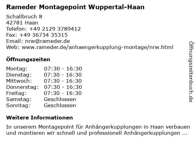 Branchen & Suchbegriffe zu Rameder Montagepoint Wuppertal-Haan:anhängerkupplung, dachbox, dachträger, einbau, elektrosatz, fahrradträger, gepäckbox, montage, montagepoint, rameder, werkstatt |