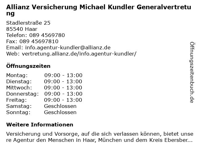 5 Allianz Versicherung Jutta Herbel Generalvertretung (Entfernung: 2,30 km) Samoastraße 22 b, 81827 München 6 AKTIVAS Assekuranz- und Immobilienmakler GmbH (Entfernung: 4,32 km) Ludwigstraße 2a, 85622 Feldkirchen |