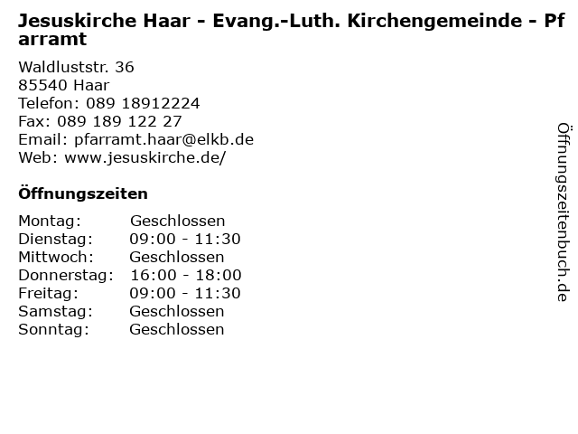 Branchen & Suchbegriffe zu Jesuskirche Haar - Evang.-Luth. Kirchengemeinde - Pfarramt:evang., haar, jesuskirche, kirchengemeinde, luth., luth. religion, pfarramt |