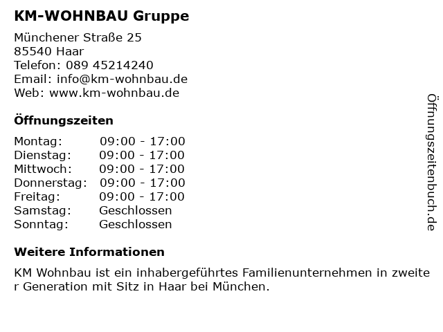 | Öffnungszeiten KM-WOHNBAU Gruppe in Haar anzeigen | |