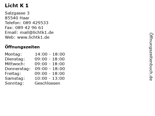 | Öffnungszeiten Licht K 1 in Haar anzeigen | |